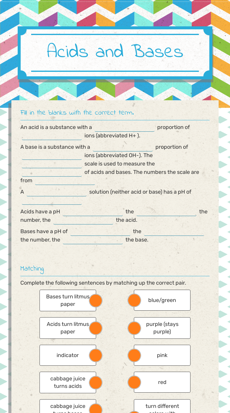 Acids/bases & ph worksheet (continued). Acids and bases other contents: Compounds with a ph higher than 7 are said to be basic or alkaline. A) the ph scale measures how acidic or basic a substance is. This worksheet contains basic conceptual questions about acids, bases, and the ph scale.what's included in this resource?printable and editable student worksheet (pdf and word document)paperless digital version for use in google drive (prepared with google slides)complete answer keyfor updates about.